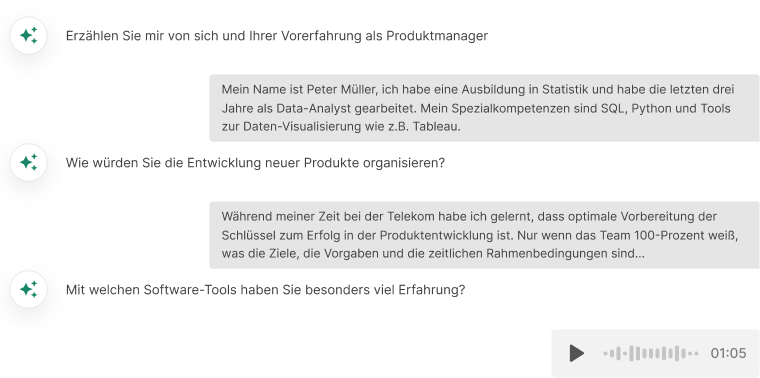 Diese dynamische Anpassung an Ihren Input sorgt für ein authentisches Interview-Erlebnis, bei dem Sie spontan reagieren und Ihre Antworten im Laufe des Gesprächs individuell anpassen können.